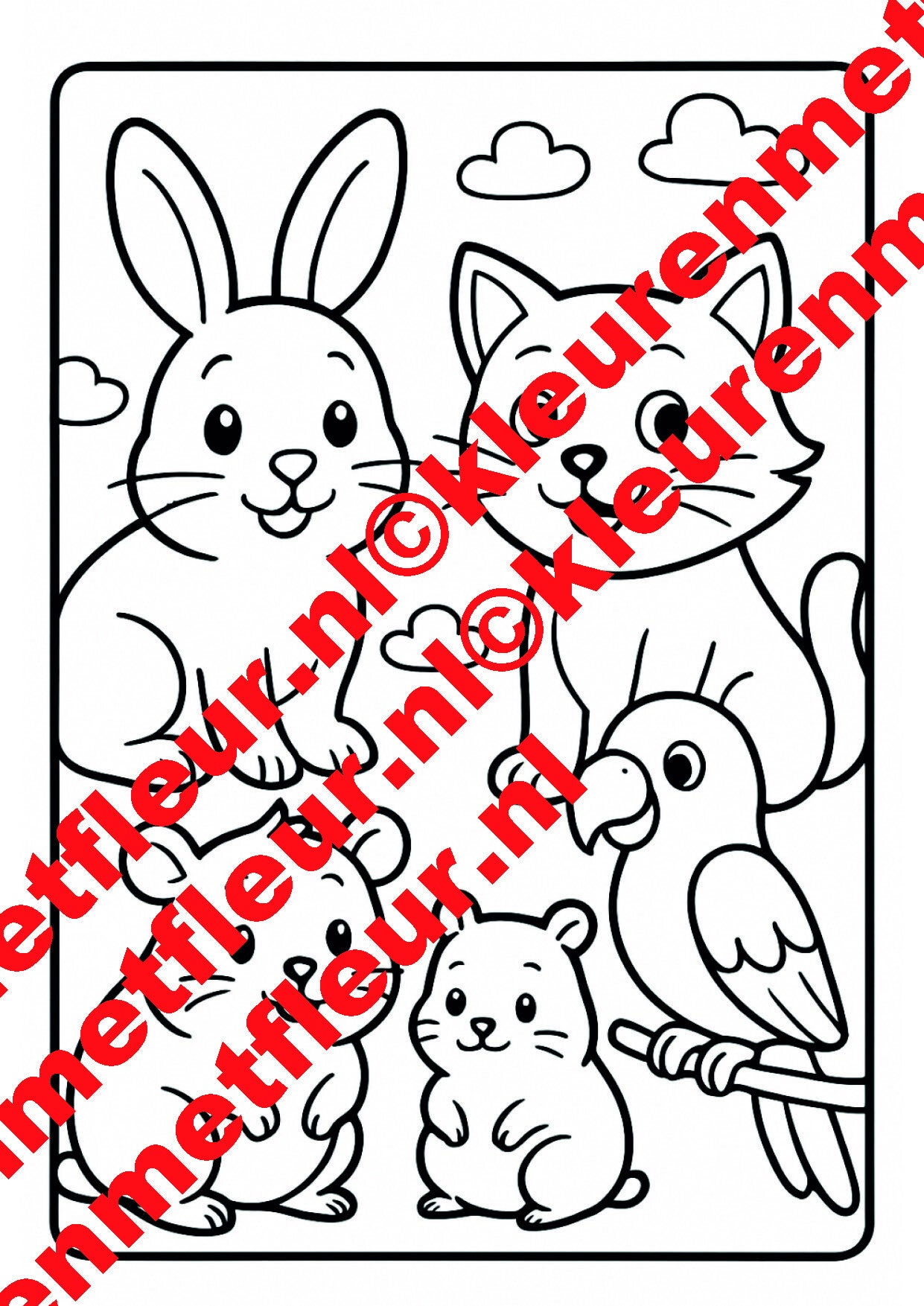 1 unieke kleurplaat als PDF-download met als thema huisdieren waaronder een konijn, een poes, een vogel, en een marmot.