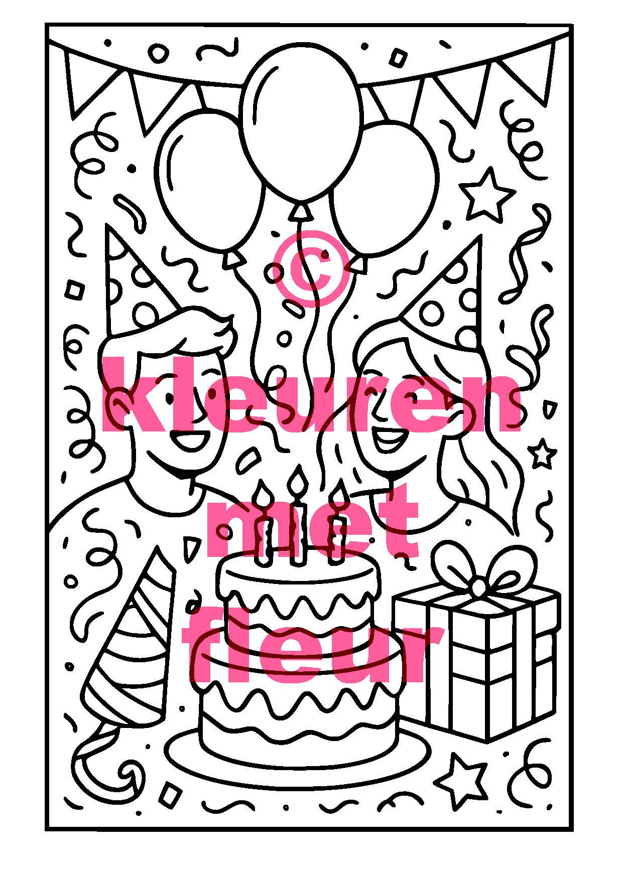 1 unieke kleurplaat als PDF-download met feestelijk tafereel met taart, slingers en ballonnen.