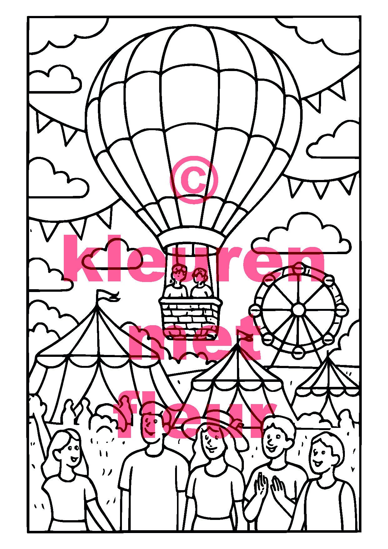 1 unieke kleurplaat als PDF-download met een luchtballon tussen de wolken.